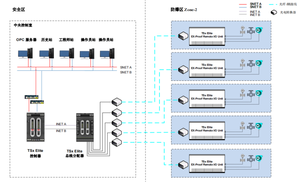 3. 在控制室部署系統(tǒng)柜,通過冗余光纖與各區(qū)域的防爆機(jī)柜內(nèi)I/O進(jìn)行數(shù)據(jù)交互。