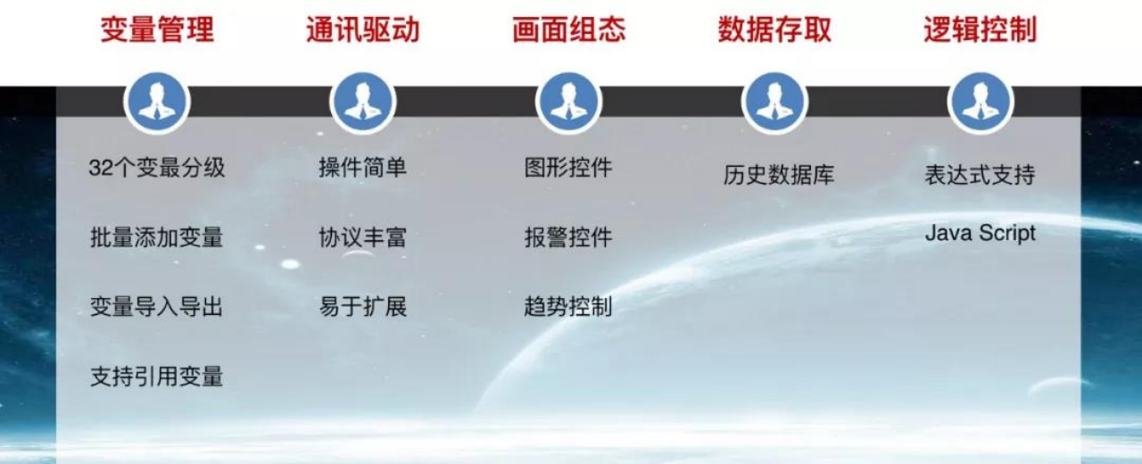 ● 開發(fā)系統(tǒng):應(yīng)用程序的集成開發(fā)環(huán)境,用于系統(tǒng)變量管理、通訊驅(qū)動、畫面組態(tài)、數(shù)據(jù)存取、邏輯控制等操作。